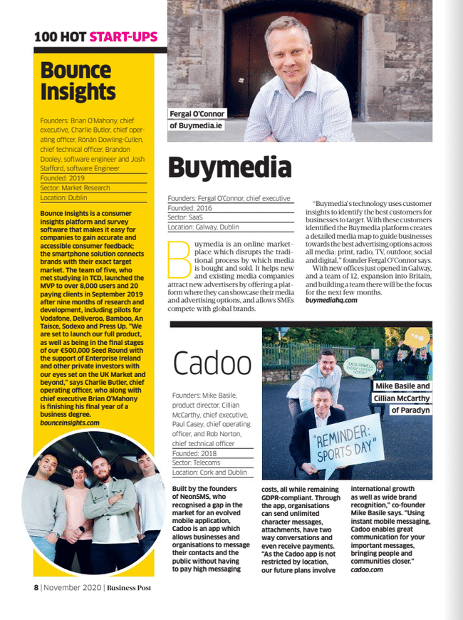 Buymedia’s technology uses customer insights to identify the best customers for businesses to target. With these customers identified the Buymedia platform creates a detailed media map to guide businesses towards the best advertising options across all media: print, radio, TV, outdoor, social and digital,” founder Fergal O’Connor says.
